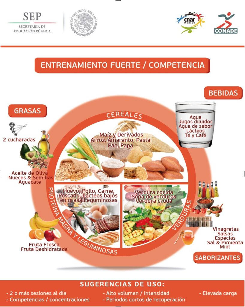 En situaciones de mayor exigencia física, como tener dos, tres o más sesiones de entrenamiento al día o estar en competencia, los cereales ocupan la mitad del plato para proporcionar la energía necesaria. Este plato está representado por el color naranja y las verduras se reducen a un cuarto del plato, preferiblemente cocidas para una digestión más rápida durante la competencia.